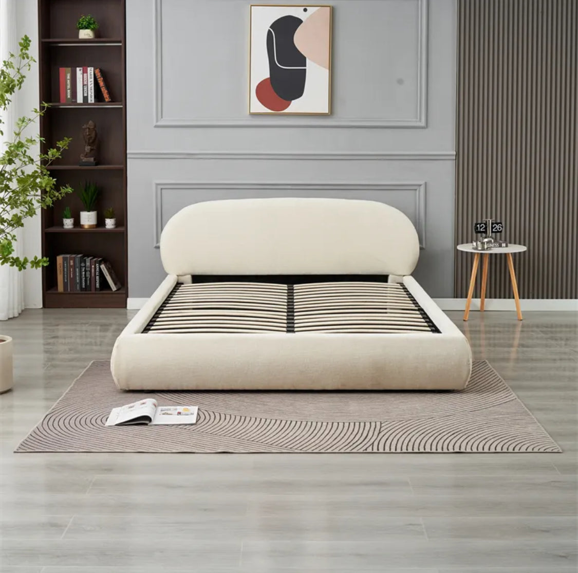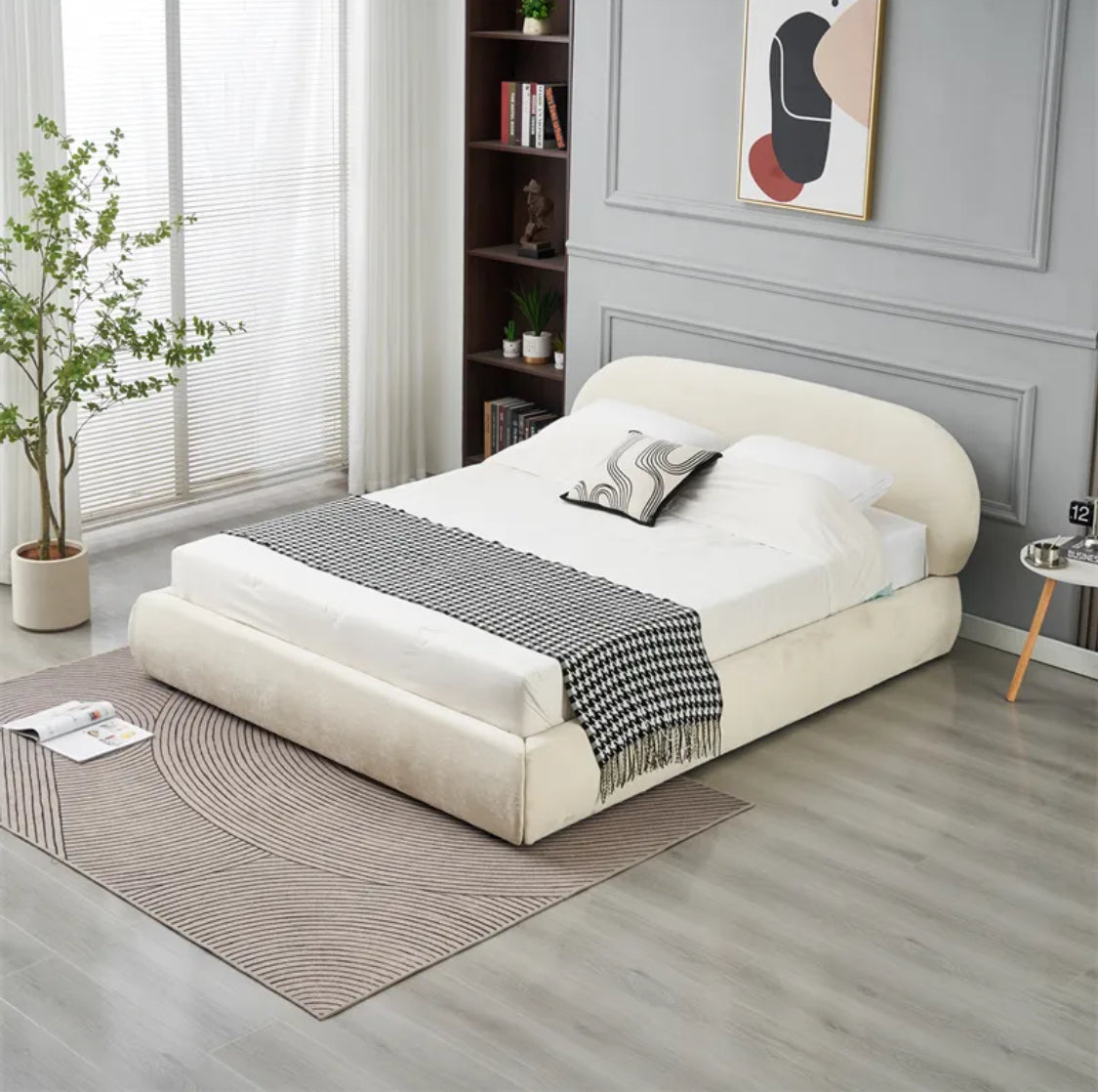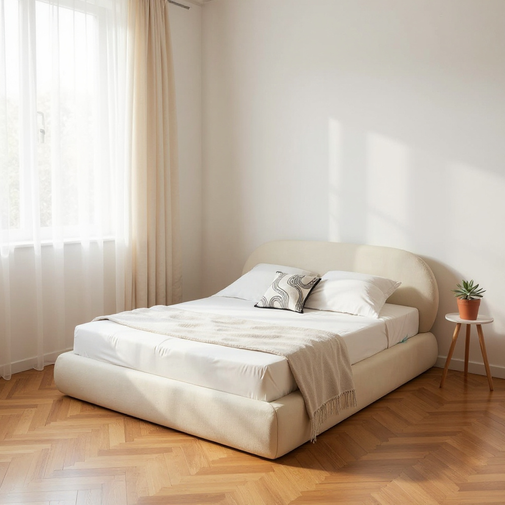 Avec sa tête de lit arrondie et son revêtement en tissu clair, il apporte une atmosphère chaleureuse et apaisante à la chambre.